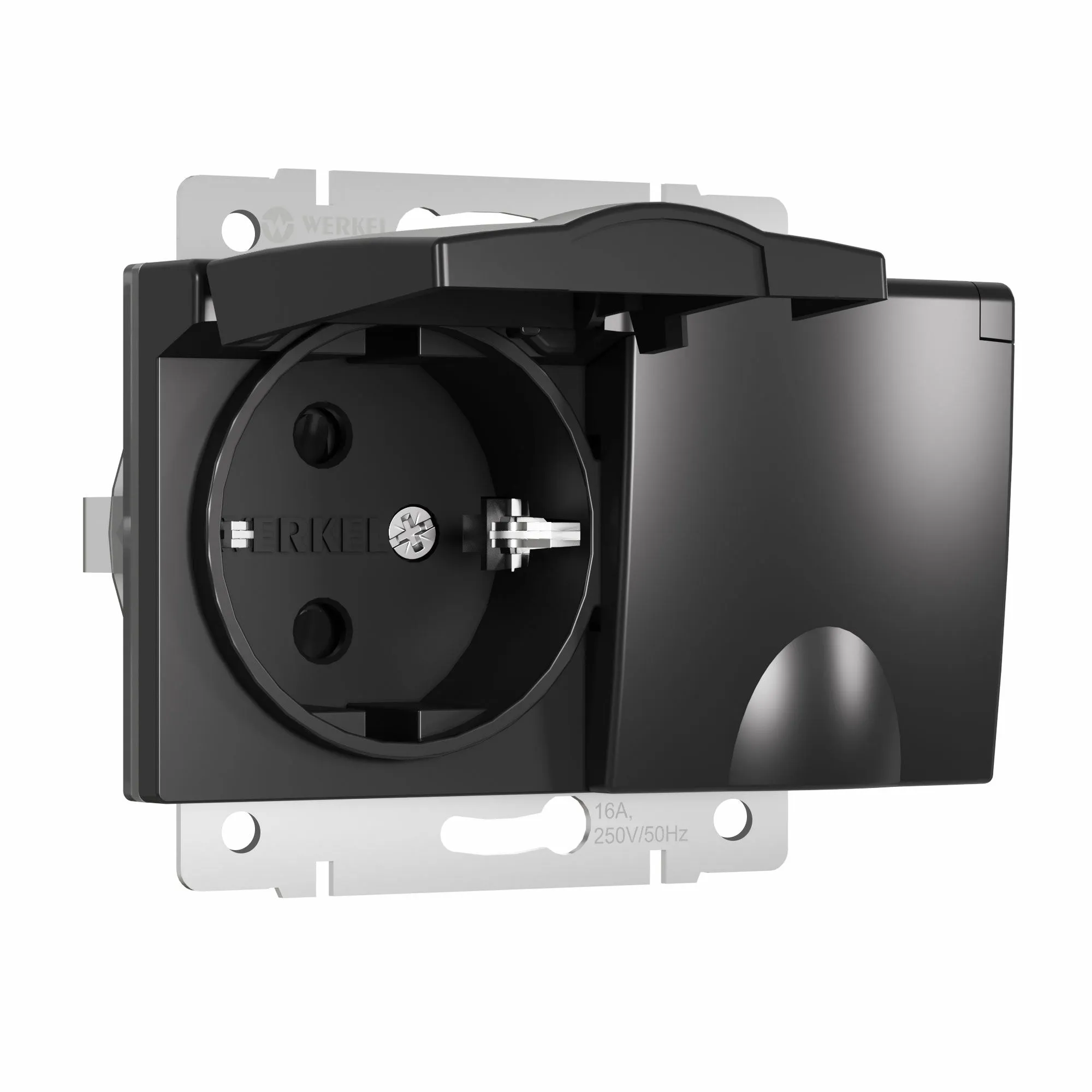 Обеспечьте надёжное и безопасное подключение электроприборов в помещениях с повышенной влажностью с влагозащищённой розеткой в цвете черный матовый от Werkel. Это современное электроустановочное изделие с защитной крышкой и шторками идеально подходит для установки в ванных комнатах, на кухнях, балконах, террасах и в частных домах.