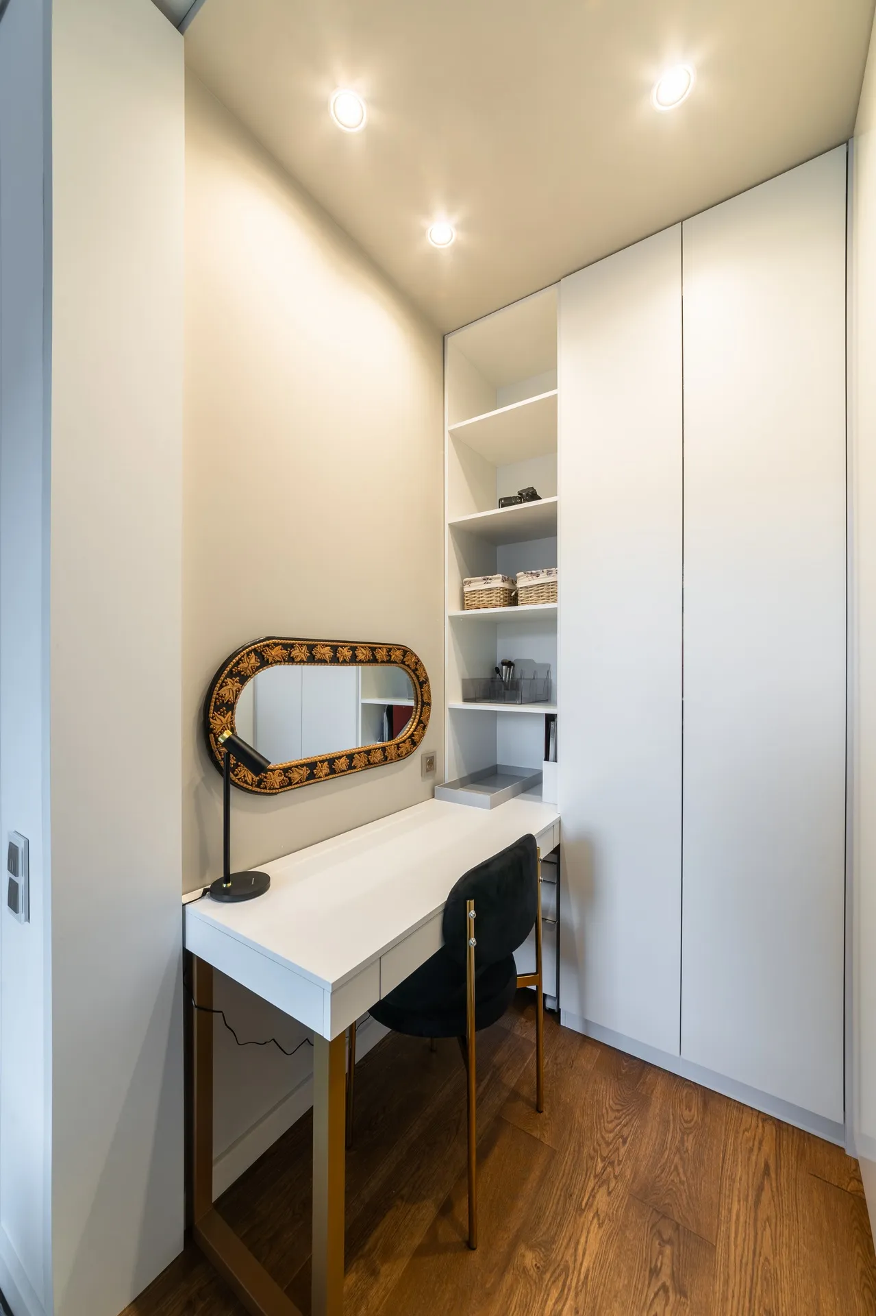 Семён, блоггер, наконец-то получил уютный мини-кабинет в спальне. На его рабочем столе появилась стильная графичная настольная лампа Joel, которая предлагает несколько режимов яркости для работы при любой освещённости. А Анна, художник и ценитель старых вещей, обзавелась гардеробной, где теперь можно хранить даже одежду со школьных лет .